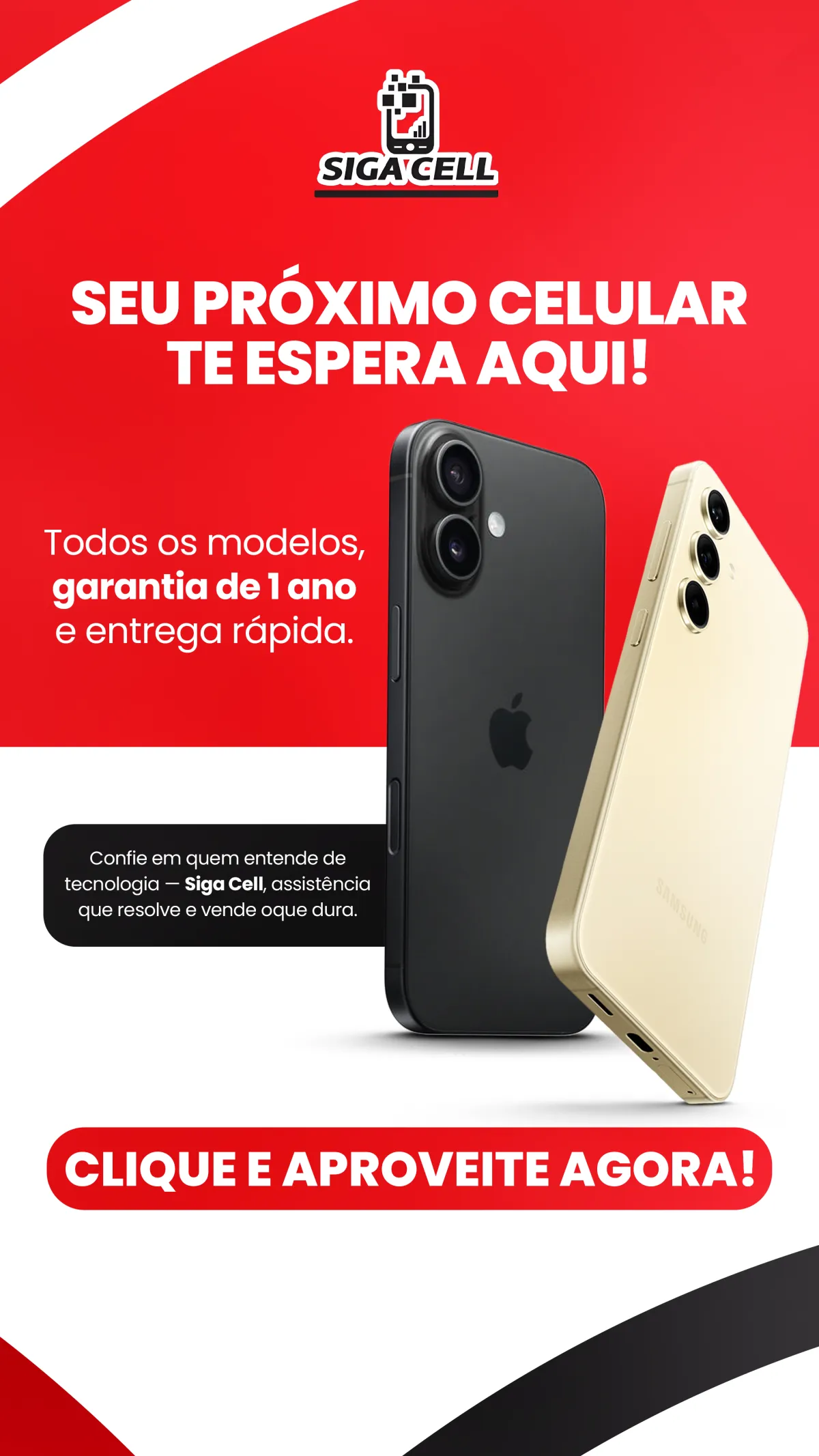 Disponibilizamos uma ampla variedade de smartphones novos e seminovos selecionados com rigor, garantindo excelente custo-benefício. Oferecemos aparelhos das principais marcas do mercado, com diferentes faixas de preço para atender desde quem busca modelos acessíveis até opções premium. Todos os dispositivos passam por conferência técnica detalhada e são entregues prontos para uso, com garantia e suporte especializado da Siga Cell.